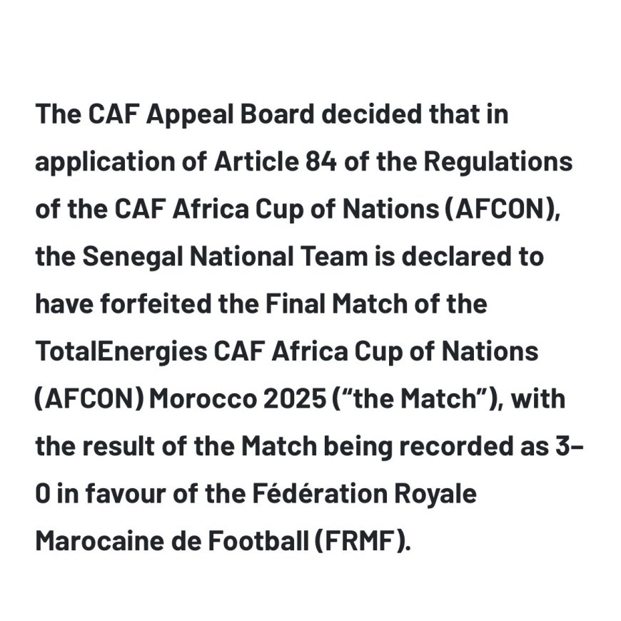 Ishyirahamwe ry'umupira w'amaguru ku mugabane wa Africa ryanzuye ko Maroc yegukanye igikombe cya AFCON nyuma yâuko CAF ihinduye ibyavuye ku mukino wa nyuma.