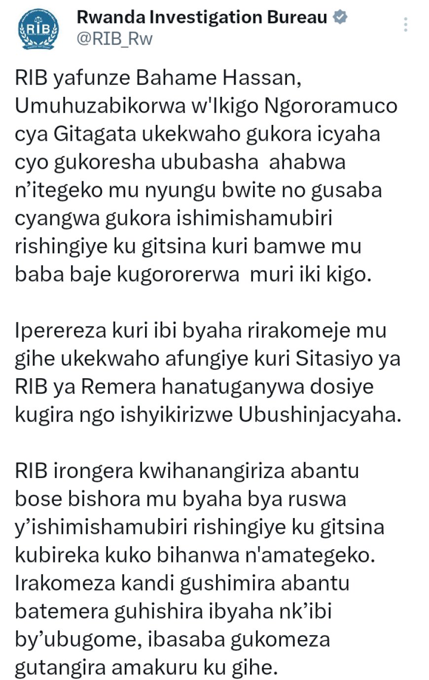 Urwego rw’Igihugu rw’Ubugenzacyaha (RIB) rwatangaje ko rwafunze Bahame Hassan, Umuhuzabikorwa w’Ikigo Ngororamuco cya Gitagata, ukekwaho gukora ibyaha birimo gukoresha ububasha ahabwa n’itegeko mu nyungu ze bwite, ndetse no gusaba cyangwa gukora ishimishamubiri rishingiye ku gitsina kuri bamwe mu baturage baba baje kugororerwa muri icyo kigo.