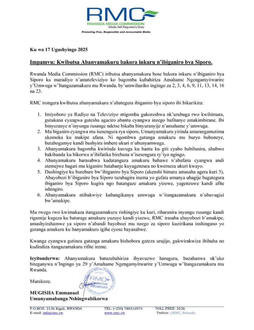 Urwego rw'abanyamakuru RMC, rwasohoye itangazo rigamije kwibutsa abanyamakuru bakora inkuru za siporo kudatandukira mu gihe bari mu busesenguzi ndetse mbere yo gutangaza inkuru bakajya babanza kumenya ko ari ukuri. RMC kandi yibukije abanyamakuru babangikanya akazi k'itangazamakuru n'ubuvugizi bw'amakipe ko ataribyo.